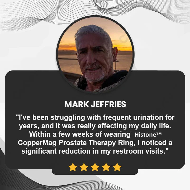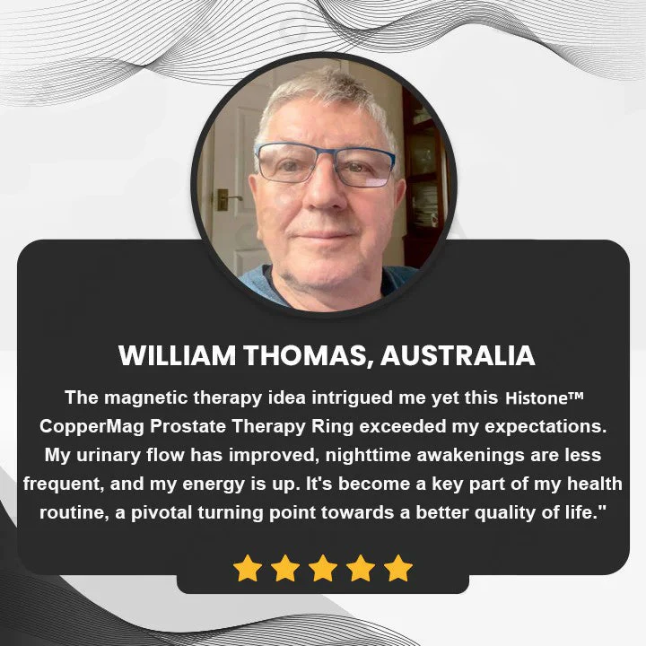 "Zaujala mě myšlenka magnetické terapie, ale prstenec pro terapii prostaty Histone™ Copper Mag předčil moje očekávání. Zlepšil se mi průtok moči, v noci se méně budím a moje energie se zvýšila. důležitější součástí mých zdravotních návyků byl kritický bod obratu ve zlepšení kvality mého života." - William Thomas