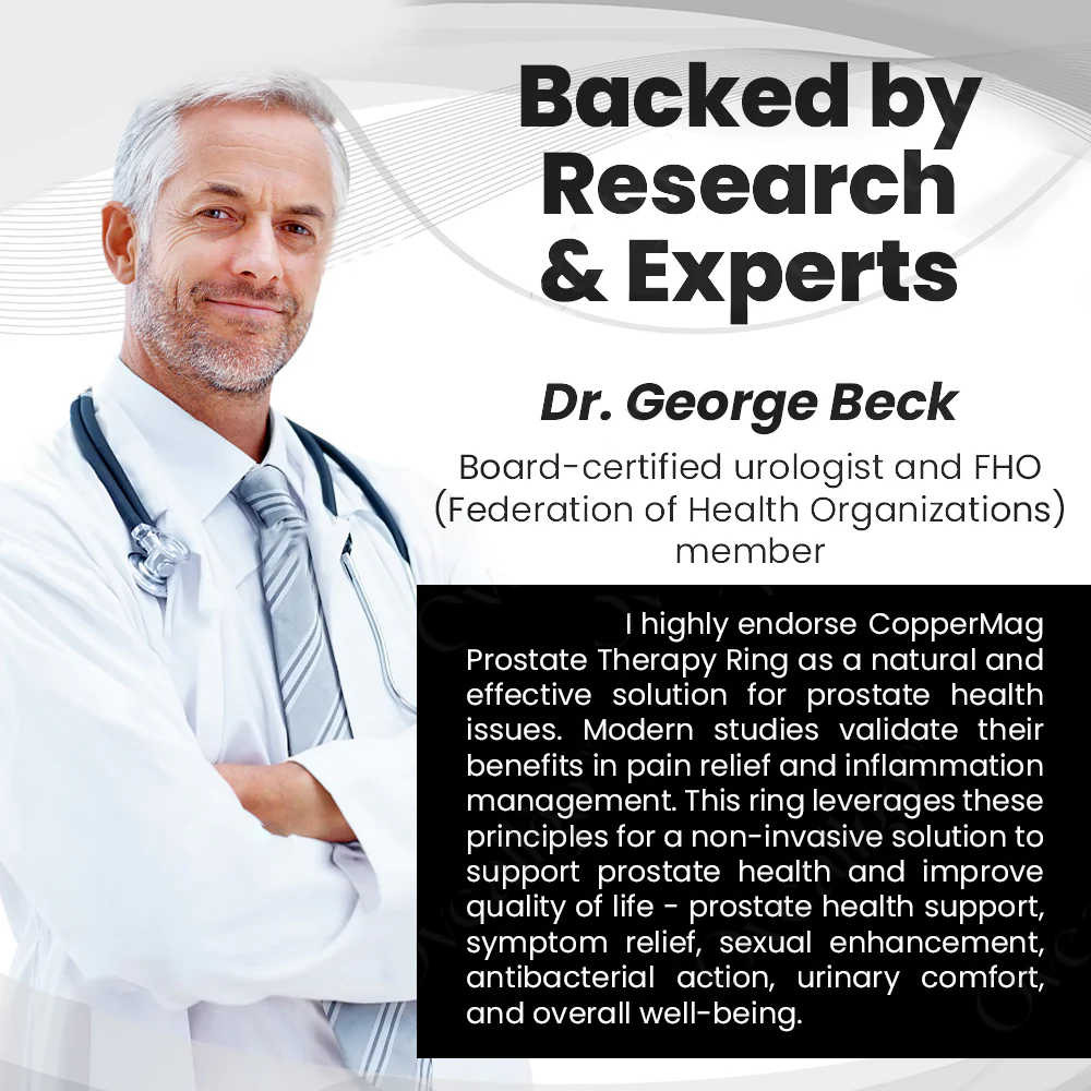 "Vřele doporučuji Therapy Ring Prostate™ Histone™ Copper Mag jako přirozený a účinný způsob, jak řešit problémy se zdravím prostaty. Moderní výzkum potvrzuje jeho výhody při úlevě od bolesti a léčbě zánětu. Tento kroužek využívá tyto principy k poskytnutí neinvazivního řešení na podporu zdraví prostaty a zlepšení kvality života – podpora zdraví prostaty, úleva od symptomů, sexuální zlepšení, antimikrobiální účinky, pohodlí při močení a celková pohoda.“ – Dr. George Baker, certifikovaný urolog a člen FHO (Federace zdravotnických organizací) .